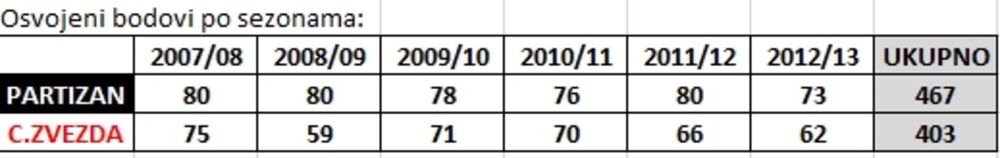 Za tih šest sezona, Partizan je napravio ukupnu bodovnu razliku od 64 boda, u proseku preko 10 po sezoni!