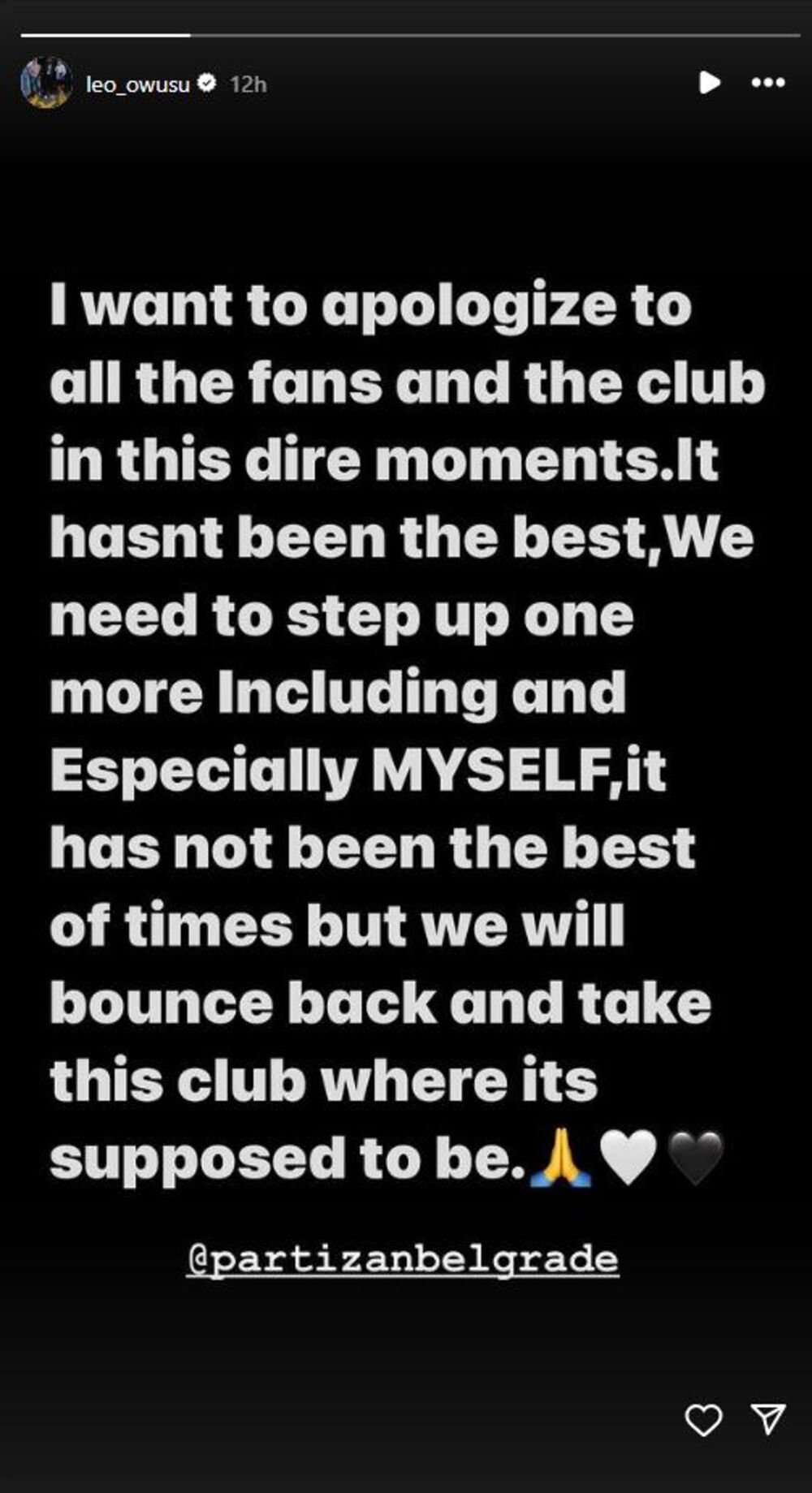- Želim da se izvinim svim navijačima i klubu u ovim teškim momentima. Nije bilo najbolje, ali moramo svi da iskoračimo još jednom, a posebno ja, nije ovo bilo najbolje vreme za nas, ali ćemo se vratiti i postavićemo ovaj klub tamo gde treba da bude - napisao je Ovusu.