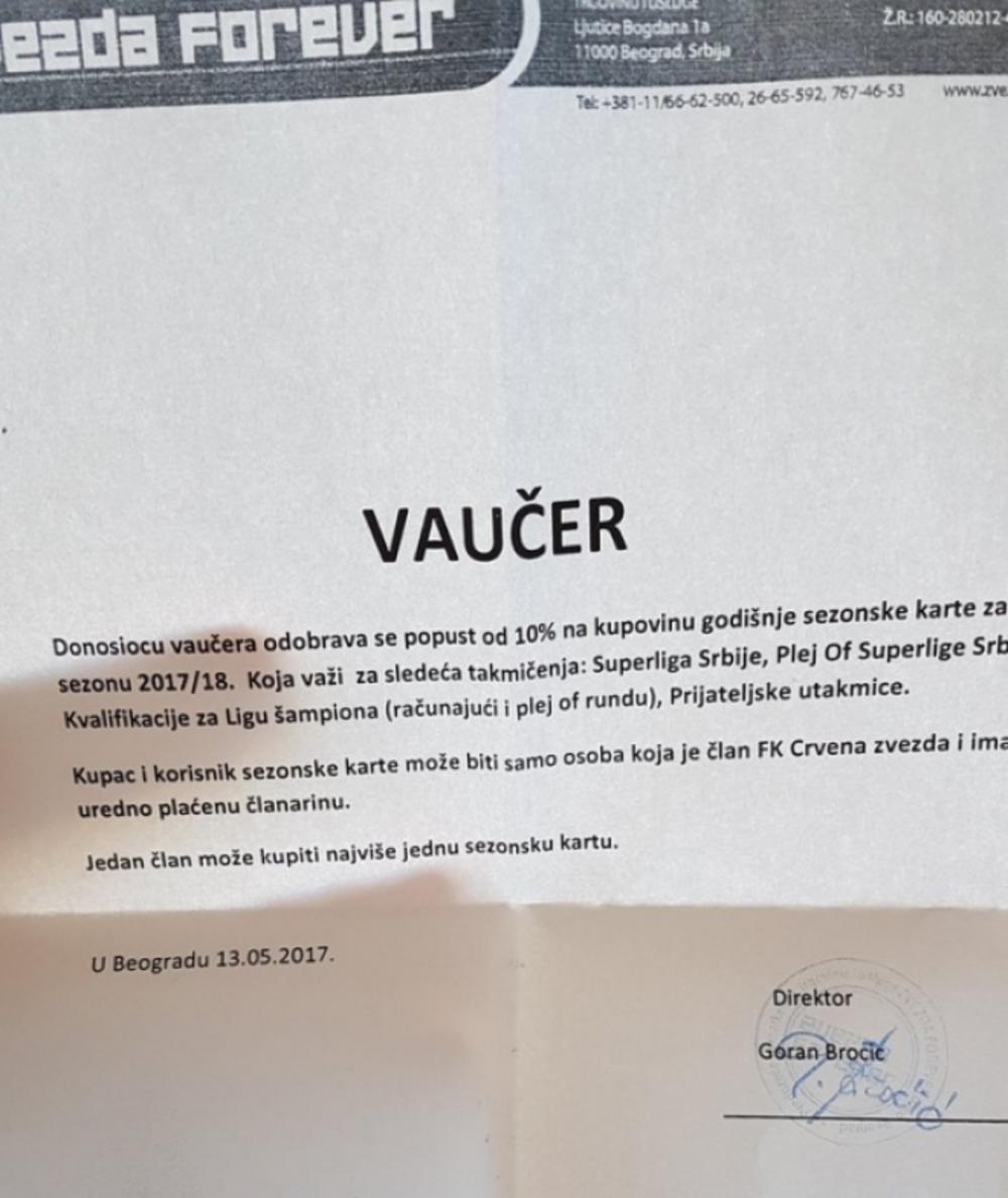 Najčudnije od svega je što je direktor marketinga Crvene zvezde Goran Broćić potpisao je takav vaučer 13. maja, u trenutku kada su crveno-beli drugi na tabeli.