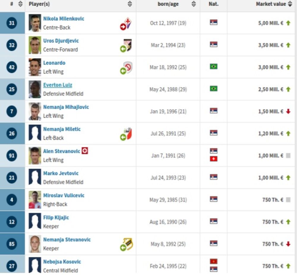 Cena je skočila i Miletiću, Jevtoviću, Tavambi, Kljajiću... Ukupna vrednost ekipe Partizana prema podacima pomenutog sajta iznosi 27,10 miliona evra, za razliku od "večitih" rivala. Ekipa Crvene zvezde vredi 23,45 miliona evra. Naravno, Transfermarkt se trudi da sve cene prikaže što je realnije moguće.