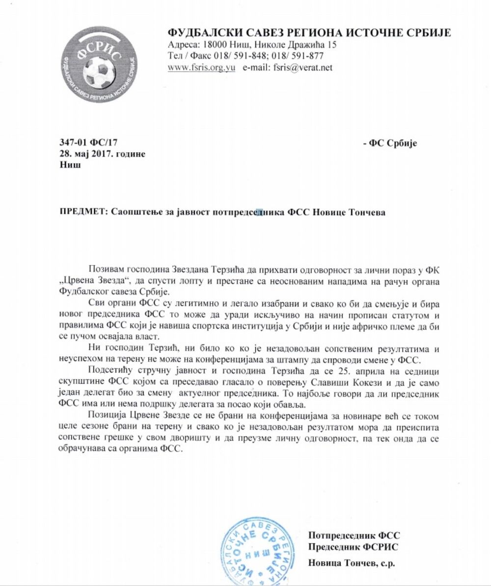Ni gospodin Terzić, ni bilo ko ko je nezadovoljan sopstvenim rezultatima i neuspehom na terenu ne može na konferencijama za štampu da sprovodi smene u FSS - između ostalog je napisao Tončev, a ostatak "saopštenja" možete da pročitate na priloženoj kopiji.