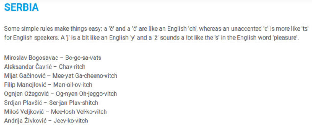 - Nekoliko jednostavnih pravila olakšava stvari - 'č' i 'ć' su veoma slični engleskim 'ch', dok je neakcentovano 'c' slično engleskom 'ts'. 'J' zvuči kao 'y', a 'ž' uglavnom podseća na 's' iz engleske reči 'zadovoljstvo' (pleasure) - napisali su.