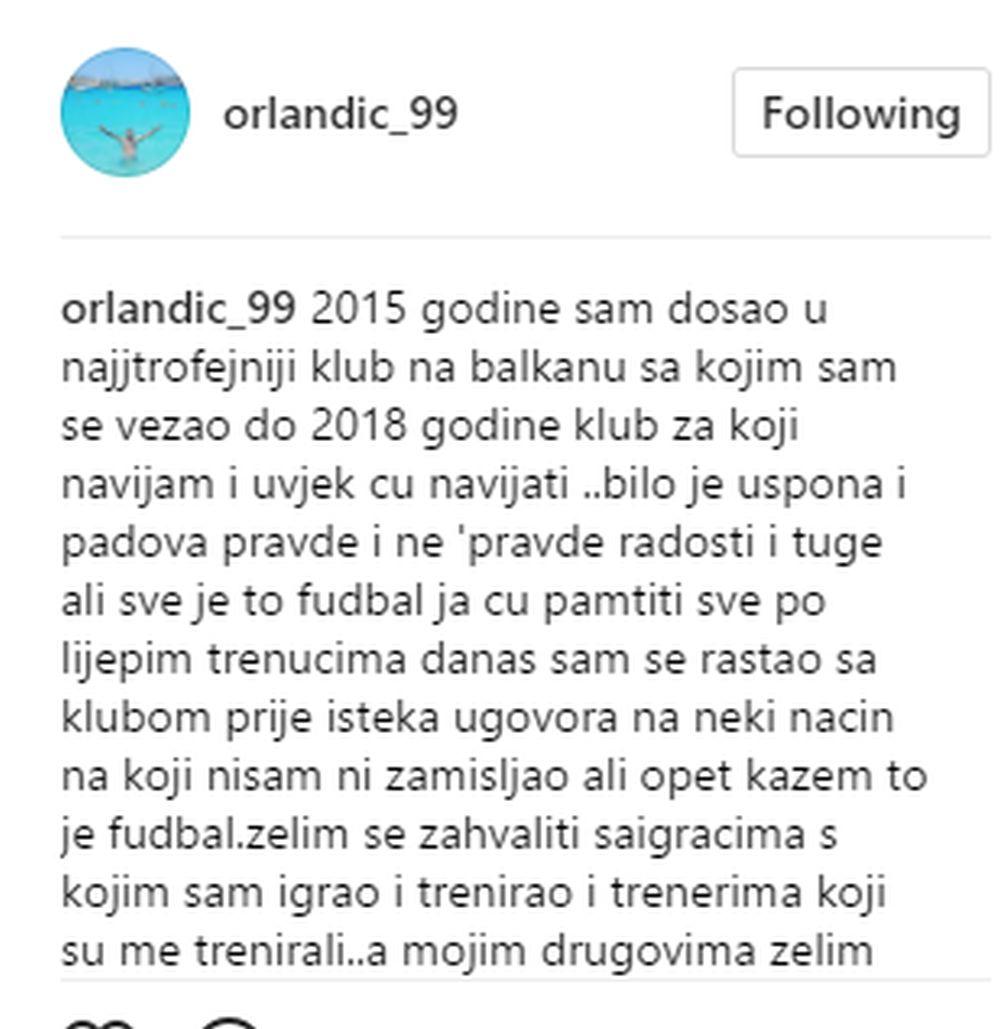 - 2015. godine sam došao u najtrofejniji klub na Balkanu sa kojim sam se vezao do 2018. godine. Klub za koji navijam i uvek ću navijati. Bilo je uspona i padova, pravde i nepravde, radosti i tuge, ali sve je to fudbal. Ja ću pamtiti sve po lepim trenucima. Danas sam se rastao sa klubom pre isteka ugovora na neki način na koji nisam ni zamišljao, ali opet kažem - to je fudbal. Želim se zahvaliti saigračima sa kojima sam trenirao i trenerima koji su me trenirali, a mojim drugovima želim puno uspeha i sreće u novoj sezoni i kvalifikacijama - poručio je Orlandić.