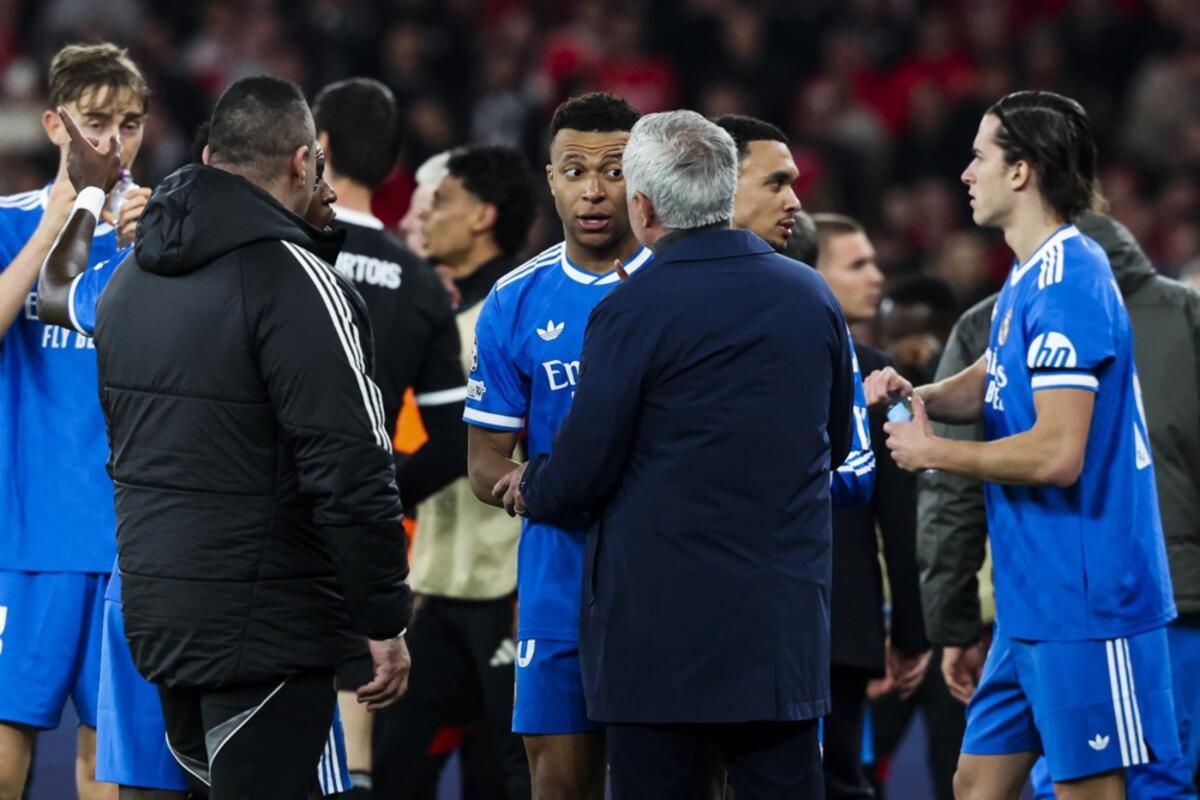 Razgovor Kilijana Mbapea i Žozea Murinja na meču Benfike i Real Madrida u prvoj utakmici baraža za osminu finala Lige šampiona u sezoni 2025/26, Foto: EPA/JOSE SENA GOULAO