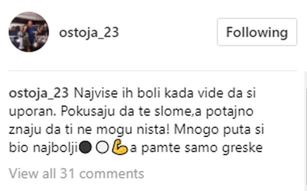 - Najviše ih boli kad vide da si uporan. Pokušaju da te lome, a potajno znaju da ti ne mogu ništa. Mnogo puta si bio najbolji, a pamte samo greške - napisao je Ostojić.