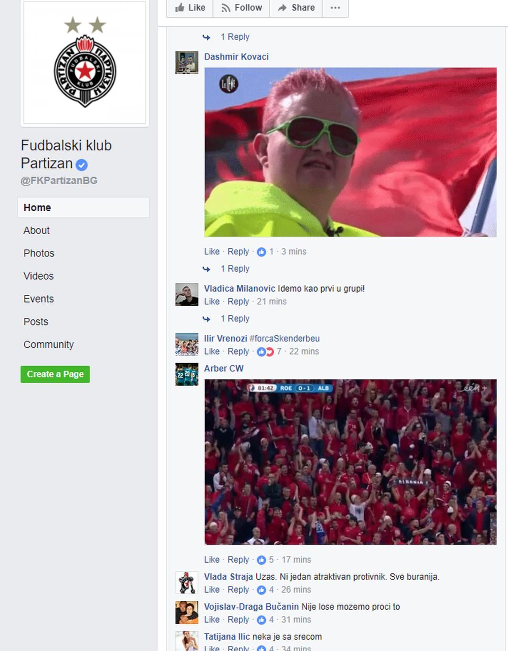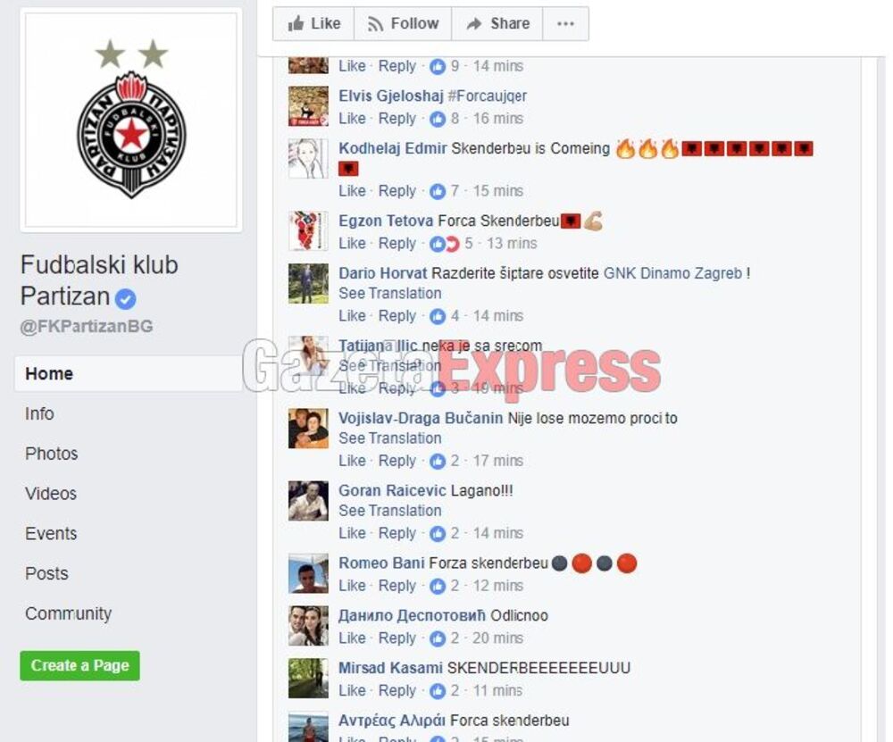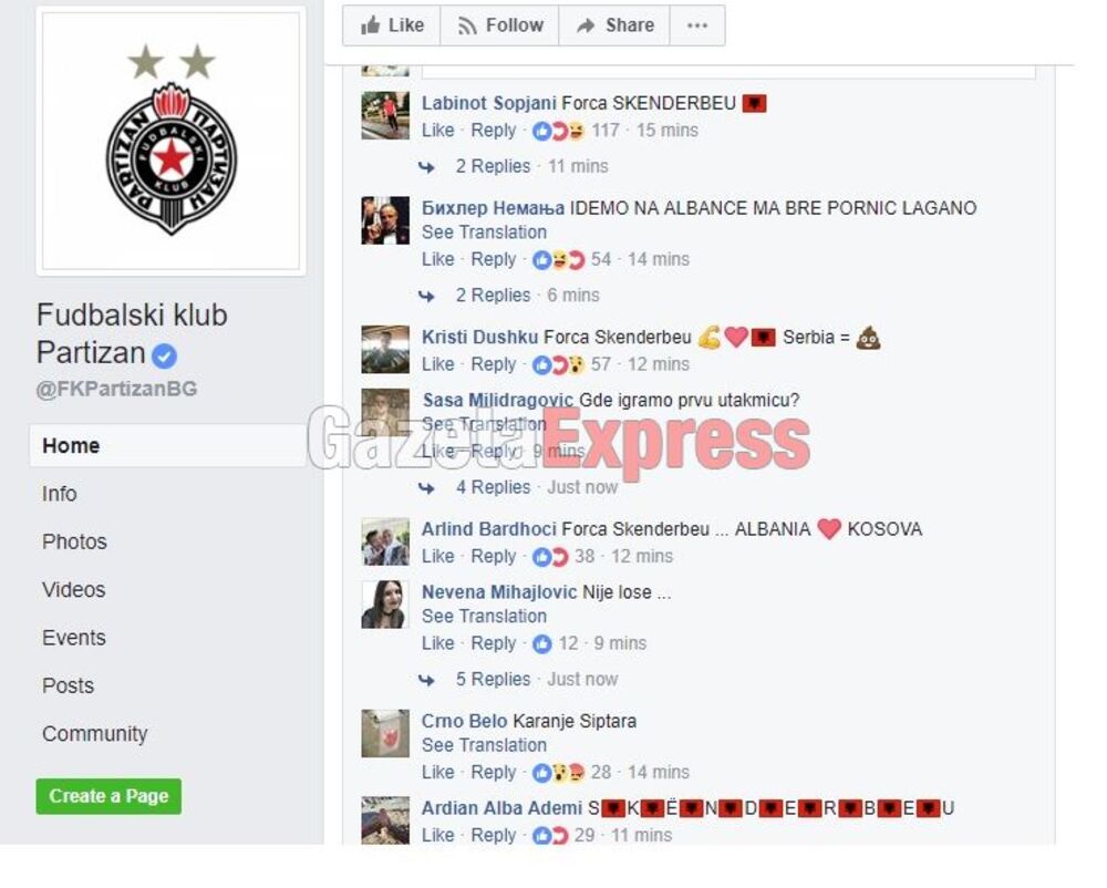 Provokacije nisu izostale ni samo nekoliko minuta nakon što je žreb spojio crno-bele sa Skenderbegom, jer su Albanci odmah zatrpali komentarima zvaničan Fejsbuk profil Partizana.