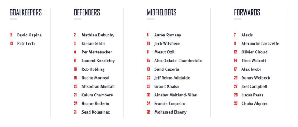 Arsenal ima fenomenalne igrače na svim pozicijama, a najveće zvezde tima su svakako golman Peter Čeh, veznjaci Remzi i Ozil, kao i napadači Aleksis Sančez, Lakazet, Volkot i Velbek.