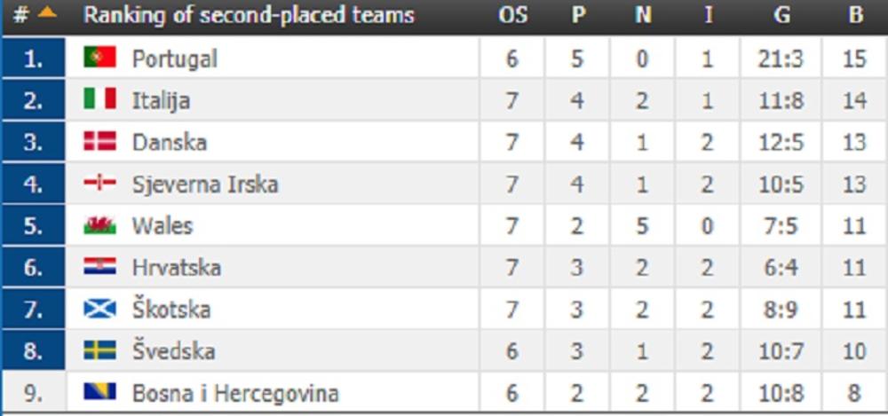 Svakoj od devet drugoplasiranih selekcija "brišu" se bodovi ostvareni protiv poslednje selekcije iz te kvalifikacione grupe u kojoj se takmiče, i tako se pravi poredak sa bodovima koji su dobijeni u osam mečeva umesto deset.