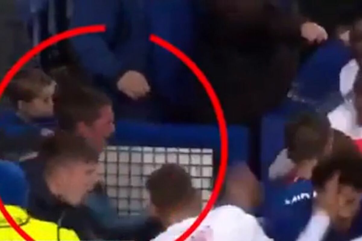 Neimenovani čovek je sa sinom u naručju, dok je trajalo koškanje fudbalera Evertona i Liona kod gola, prišao ivici tribine i udario jednog od igrača francuskog tima.
