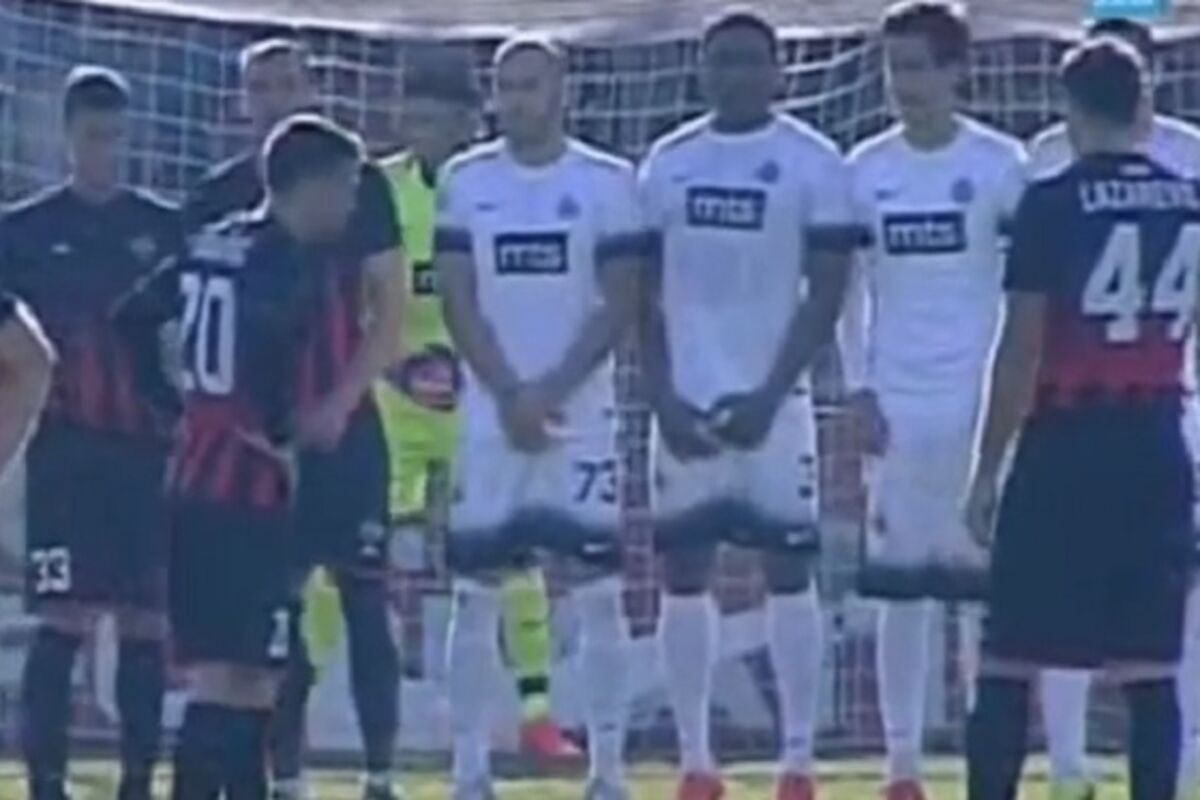 Everton je nesmotrenom reakcijom napravio faul na oko 18 metara od gola, a bek šabačkog tima Lazarević je izveo prekid i pogodio sam ugao gola koji brani Vladimir Stojković.