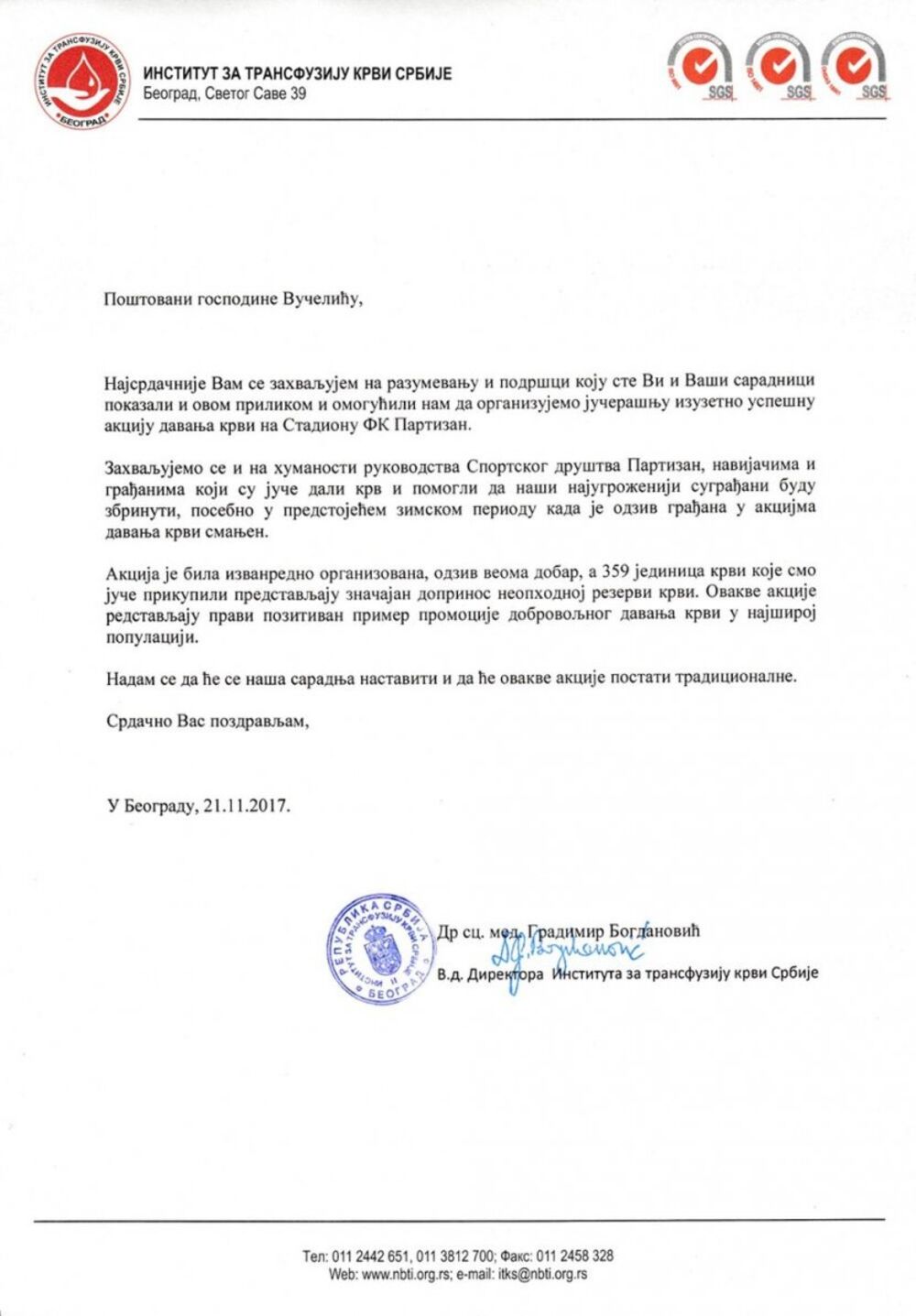 Na ovaj način će biti sačuvani mnogi životi, pa je iz Instituta za transfuziju krvi Srbije na adresu kluba iz Humske stiglo pismo zahvalnosti, adresirano na predsednika crno-belih Milorada Vučelića.