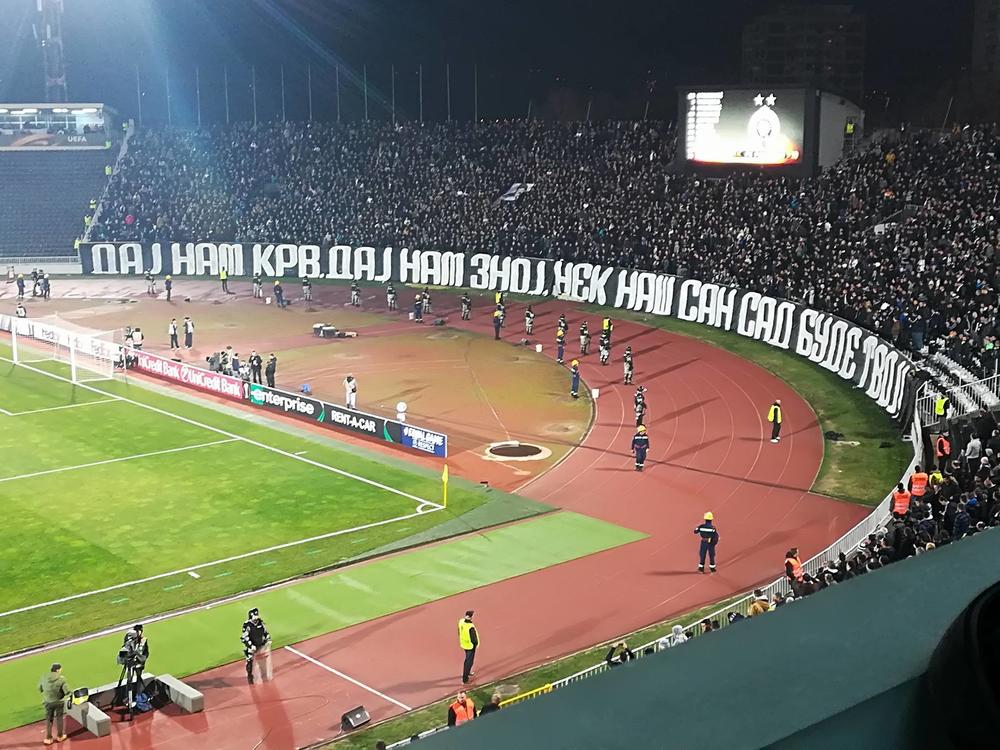 9. minut - Grobari su častili igrače koreografijom, a ovi su počeli žustrije nego gosti, možemo da očekujemo jak pritisak Partizana.