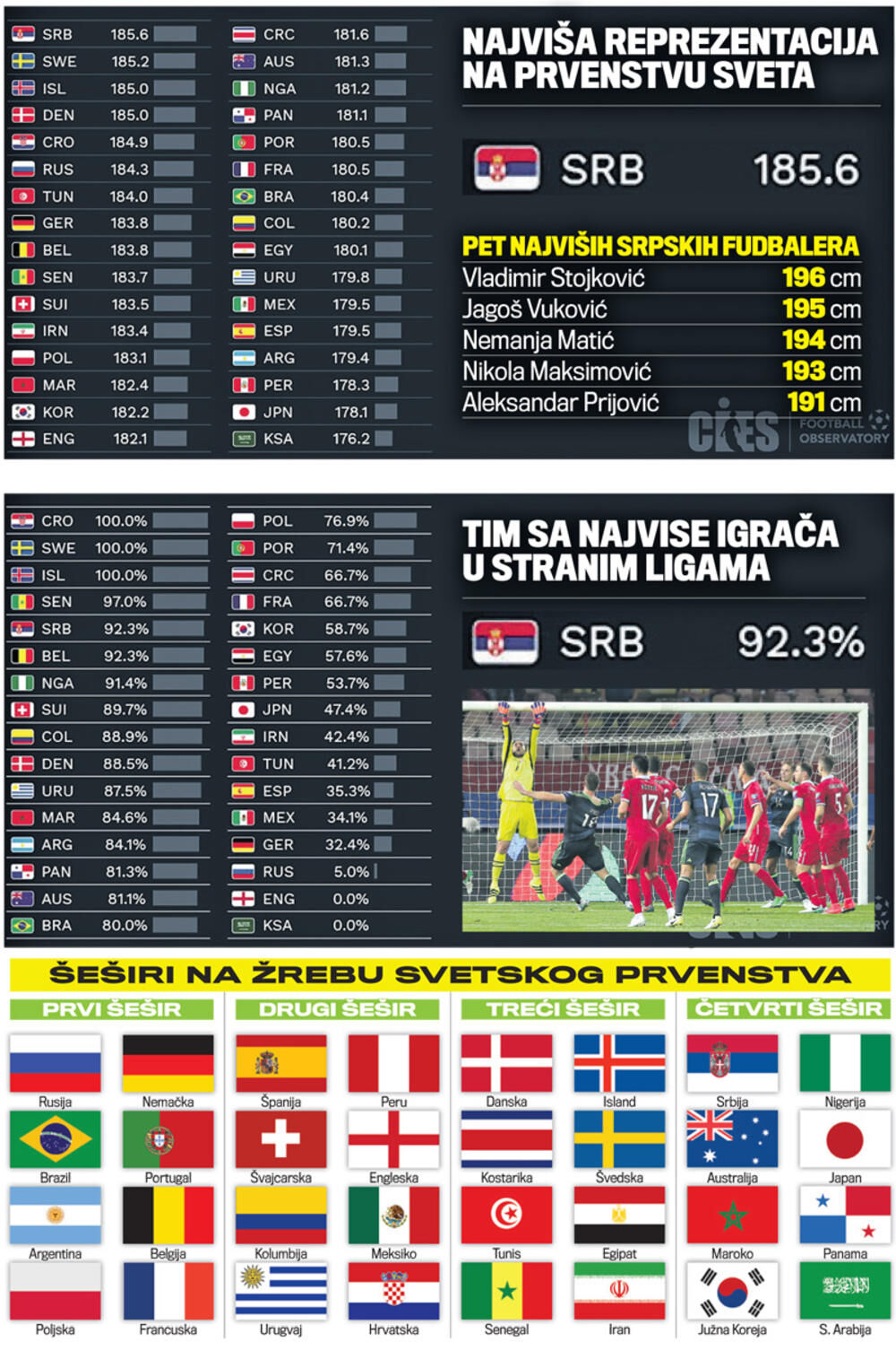 S prosečnom visinom od 185,6 centimetara naši fudbaleri biće divovi u odnosu na ostale učesnike Svetskog prvenstva. Srbija na 12. mestu po starosti igrača, s prosekom od 27,7 godina.