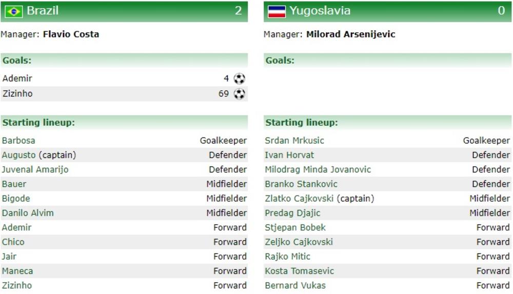 Na stadionu Marakana u Rio de Žaneiru je bilo prisutno neverovatnih 140.000 gledalaca, a domaća ekipa je slavila sa 2:0 golovima Ademira i Zizinja.