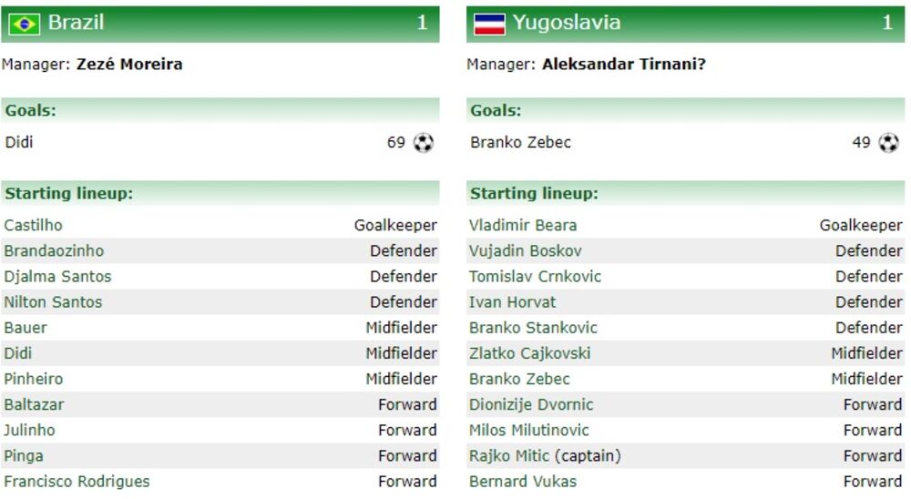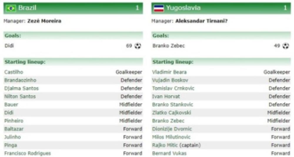 Brazil i Jugoslavija su tada prošli grupu, ali oba tima su zaustavljena u četvrtfinalu - Zapadna Nemačka je savladala Jugoslaviju, sa 2:0, a kasniji vicešampion Mađarska je je izbacio Brazil. Bilo je 4:2.