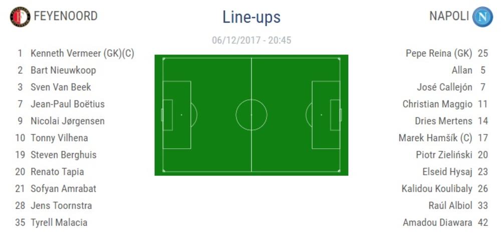 Za to vreme u Roterdamu, Napoli je sjajno počeo, poveo je golom Zjelinskog već u drugom minutu, ali su domaći golom Jorgensena izjednačili pola sata kasnije. Juste je u nadoknadi vremena doneo sva tri boda Fejenordu, ujedno i prve bodove Holanđanima ove sezone u LŠ.