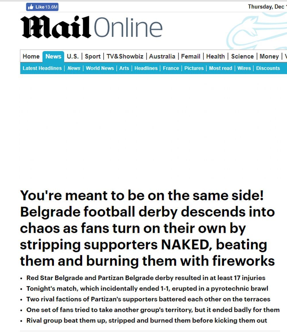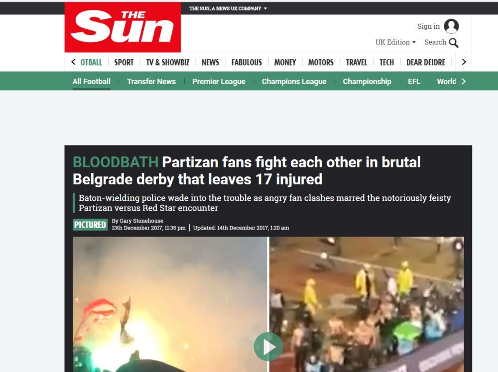 - Meč između Zvezde i Partizana je uvek zaokružen u kalendaru kao jedan od najbrutalnijih rivaliteta na svetu. Ali, ovoga puta nije bila potrebna međusobna netrpeljivost ljudi koji navijaju za različite klubove, jer su se Partizanove pristalice okrenule jedne protiv drugih. Jedna od grupa je ušla na teritoriju druge, a to se po nju završilo kobno, jer su bili prebijeni, prženi i izbačeni na teren polugoli - piše britanski portal.