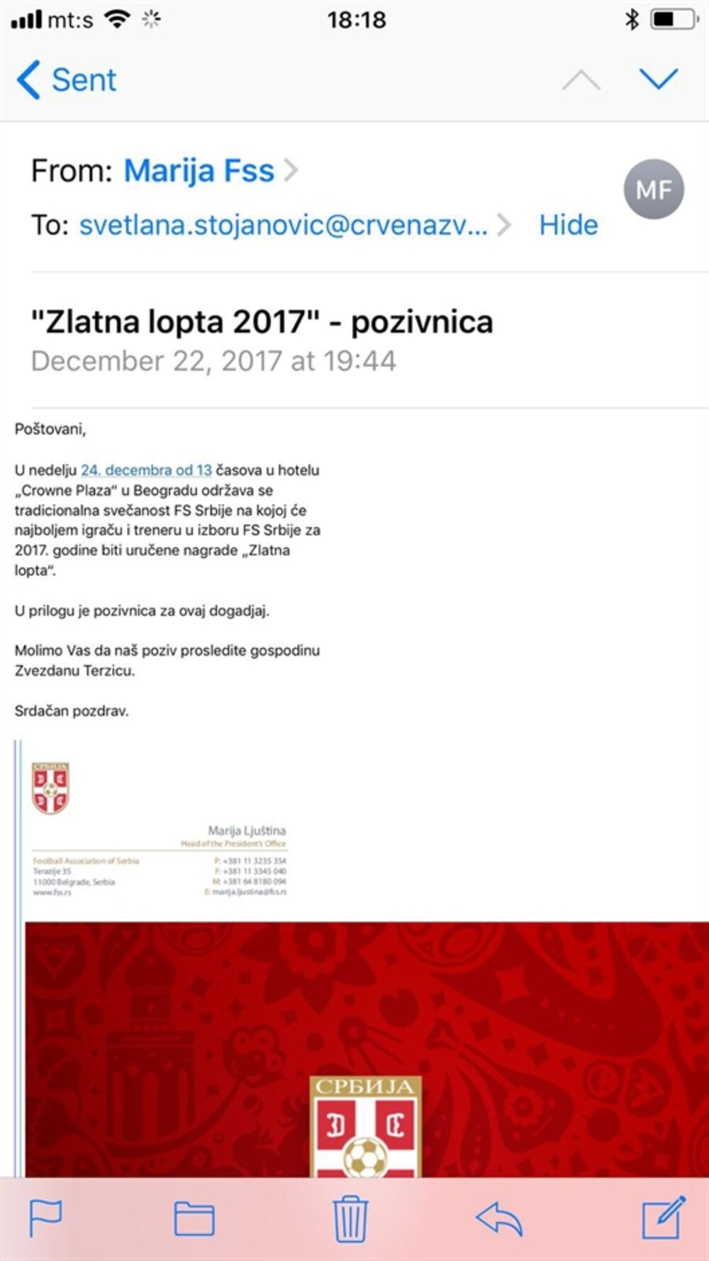 - Obaveštavam vas da je FK Crvena zvezda uredno dobila poziv mejlom na svečanost 'Zlatna lopta' o čemu pretpostavljam portparol FK Crvena zvezda nije bio blagovrenemo obavešten i kako bismo izbegli bilo kakvu konfuziju u vezi sa ovom temom, molim vas da objavite sve što je ovde navedeno kao moju izjavu. Takođe, u prilogu imate dokumenta koja potvrđuju da je rukovodstvo FK Crvena zvezda pozvano na svečanost - navodi se u poruci iz FSS.