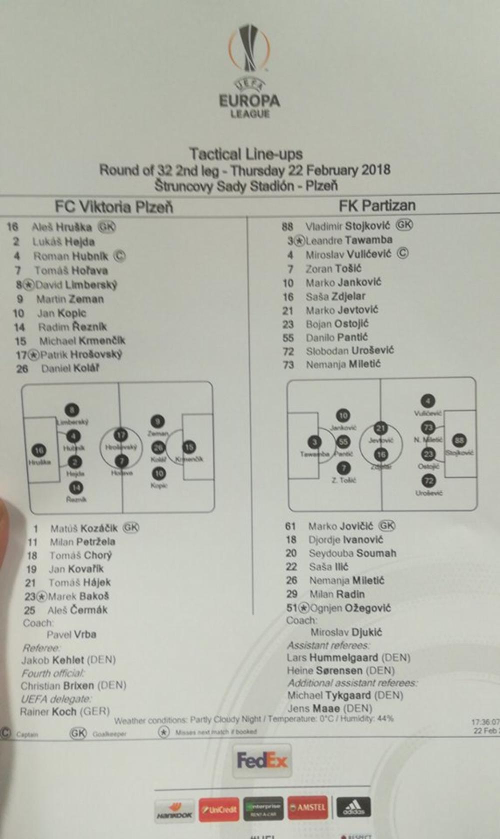 Viktorija Plzenj (4-2-3-1): Hruška – Ržeznik, Hejda, Hubnik, Limberski – Horžava, Hrošovski – Kopic, Kolaž, Zeman – Krmenčik Partizan (4-2-3-1): Stojković – Vulićević, N. R. Miletić, Ostojić, Urošević – Zdjelar, Jevtović – Janković, Pantić, Tošić – Tavamba
