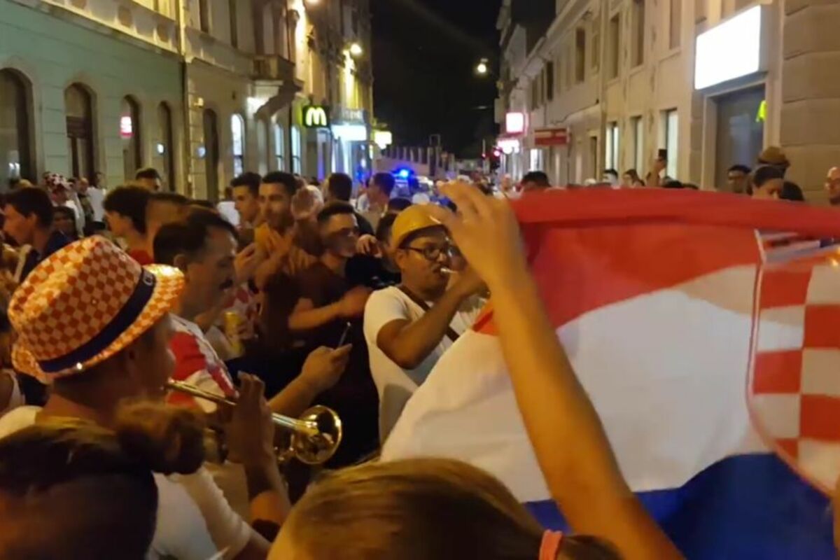 Na video snimku, koji je postao hit na internetu, vidi se kako Hrvati u obeležjima reprezentacije sa oduševljenjem slave uz trubače, koji su takođe sa rekvizitima.