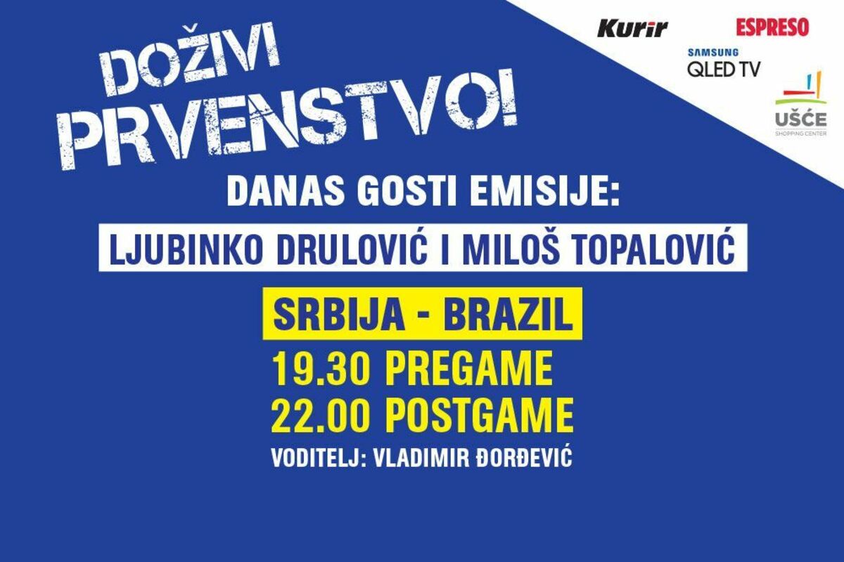 Popularni Drula tokom svoje karijere u Portu igrao je sa igračima Brazila i preneće nam svoje utiske o njihovoj igri i gde postoje šanse za “orlove” u okršaju sa “kariokama”? Sa poznatim Topom, koji je godinama izveštavao sa Svetskih prvenstava i koji već dugi niz godina prati našu reprezentaciju, pričaćemo o “orlovima” i dosadašnjme toku prvenstva. Nakon meča, uz šampanjac ili uz maramice, analiziraćemo “meč veka za Srbiju”!