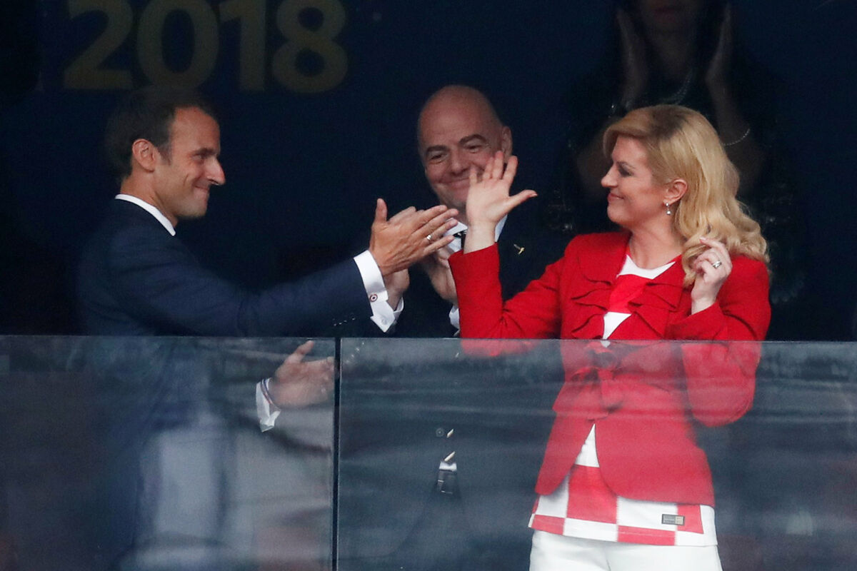Nakon završetka utakmice prošetala je do centra moskovskog stadiona s francuskim predsednikom Emanuelom Makronom i ruskim predsednikom Vladimirom Putinom i tada je krenula predstava. Frenetična Kolinda nakon što je izgrlila i izljubila sve hrvatske fudbalere, na kraju se doslovno obesila oko vrata Zlatka Dalića, a nakon toga nastavila je da se veša o vrat i francuskim reprezentativcima, sudijama... Ukratko svima. Taktilna Kolinda svako malo dodirnula je i Makrona, a da je mogla dohvatila bi se verovatno i Putina.