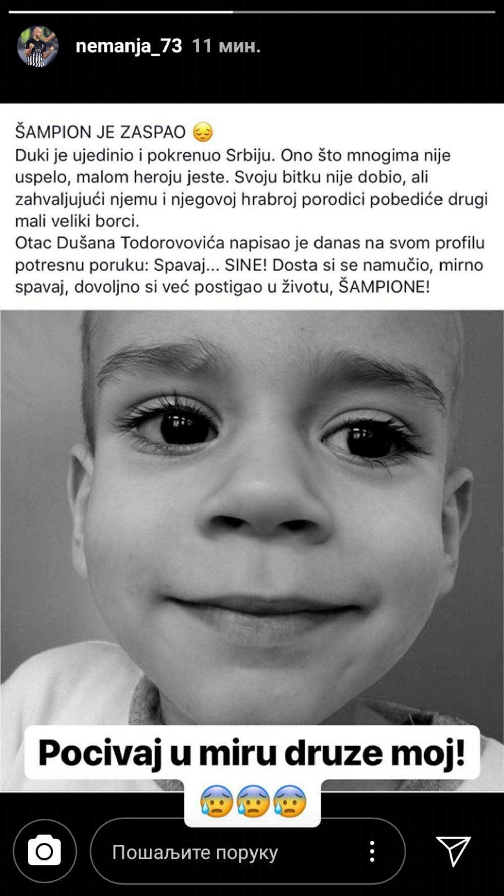 Nažalost, njegov maleni drugar nije uspeo da prebrodi ovu tešku bitku. - Počivaj u miru, druže moj - napisao je Miletić uz sliku malog Dušana.
