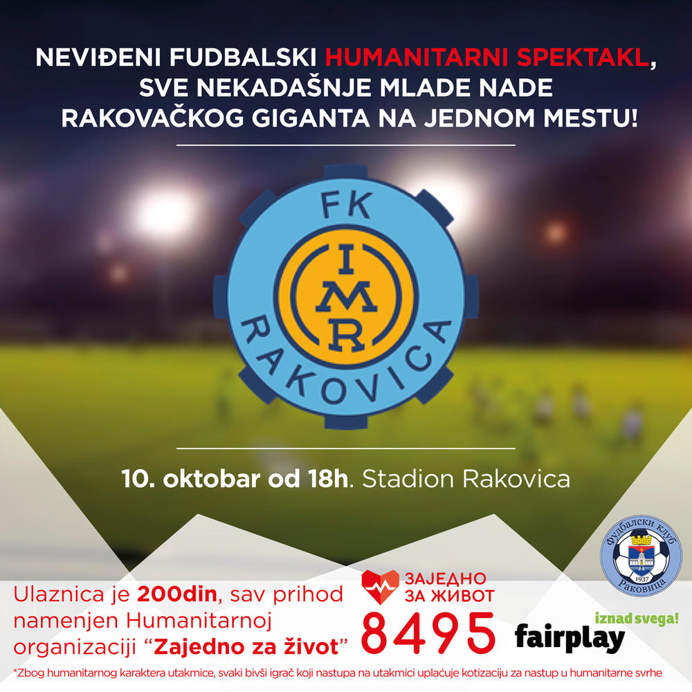 Zbog toga pozivamo sve raspoložene građane da dođu 10. oktobra od 18h na stadion Rakovice, ulaz će se naplaćivati 200 dinara, a sav prihod od ulaznica, kao i od kotizacija igrača koji igraju, takođe je namenjen Humanitarnoj organizaciji „Zajedno za život“ koja postoji više od godinu dana i uspešno pomaže oboleloj deci u procesu lečenja.