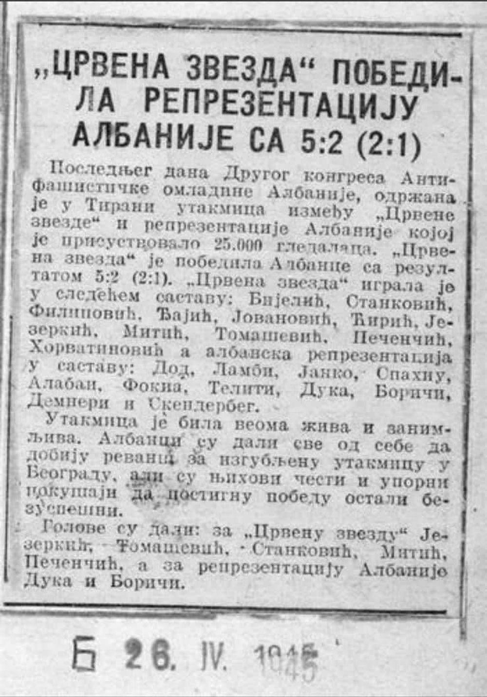 Pobedila je Zvezda 5:2. Dakle, dok je naš narod u okviru JNA ratovao i dalje na teritoriji Jugoslavije, dotad je Crvena zvezda bila osnivana i igrala prijateljske utakmice. 8.Pokušaj da se nametne da je Crvena zvezda osnovana kao neka vrsta “reakcije beogradske manguparije na zagrebačko osnivanje Partizana”, ovim se potpuno razvejava. Nit je Partizan osnovan pre Crvene zvezde, da bi to bila reakcija Crvene zvezde, niti je reč o zagrebačkom osnivanju, niti ovde ima govora o nekakvoj “beogradskoj mangupariji”. FK Partizan je osnovan tek nakon svih ratnih dejstava u Drugom svetskom ratu, 4. oktobra 1945. godine u Beogradu, i, kao takav, nije učestvovao u ovom okružnom kvalifikacionom ciklusu za prvo posleratno prvenstvo Jugoslavije, ali je u njemu učestvovao i u njemu osvojio svoju prvu šampionsku titulu kao predstavnik Jugoslovenske narodne armije. Srbija je, dakle, u prvom šampionatu Jugoslavije imala tri predstavnika: pobednika okruga centralne Srbije, pobednika okruga Vojvodine i predstavnika Jugoslovenske narodne armije.