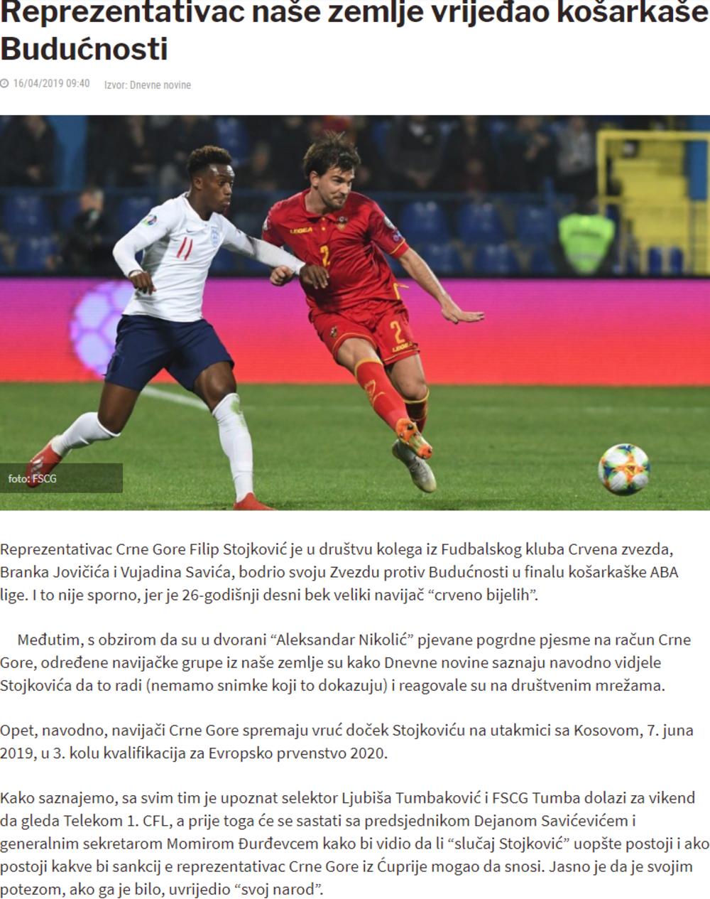 - S obzirom da su u dvorani 'Aleksandar Nikolić' pevane pogrdne pesme na račun Crne Gore, određene navijačke grupe iz naše zemlje su, kako 'Dnevne novine' saznaju, navodno videle Stojkovića da to radi (nemamo snimke koji to dokazuju) i reagovale su na društvenim mrežama - piše crnogorski portal CDM i dodaje da je i selektor Ljubiša Tumbaković upoznat sa ovim slučajem.