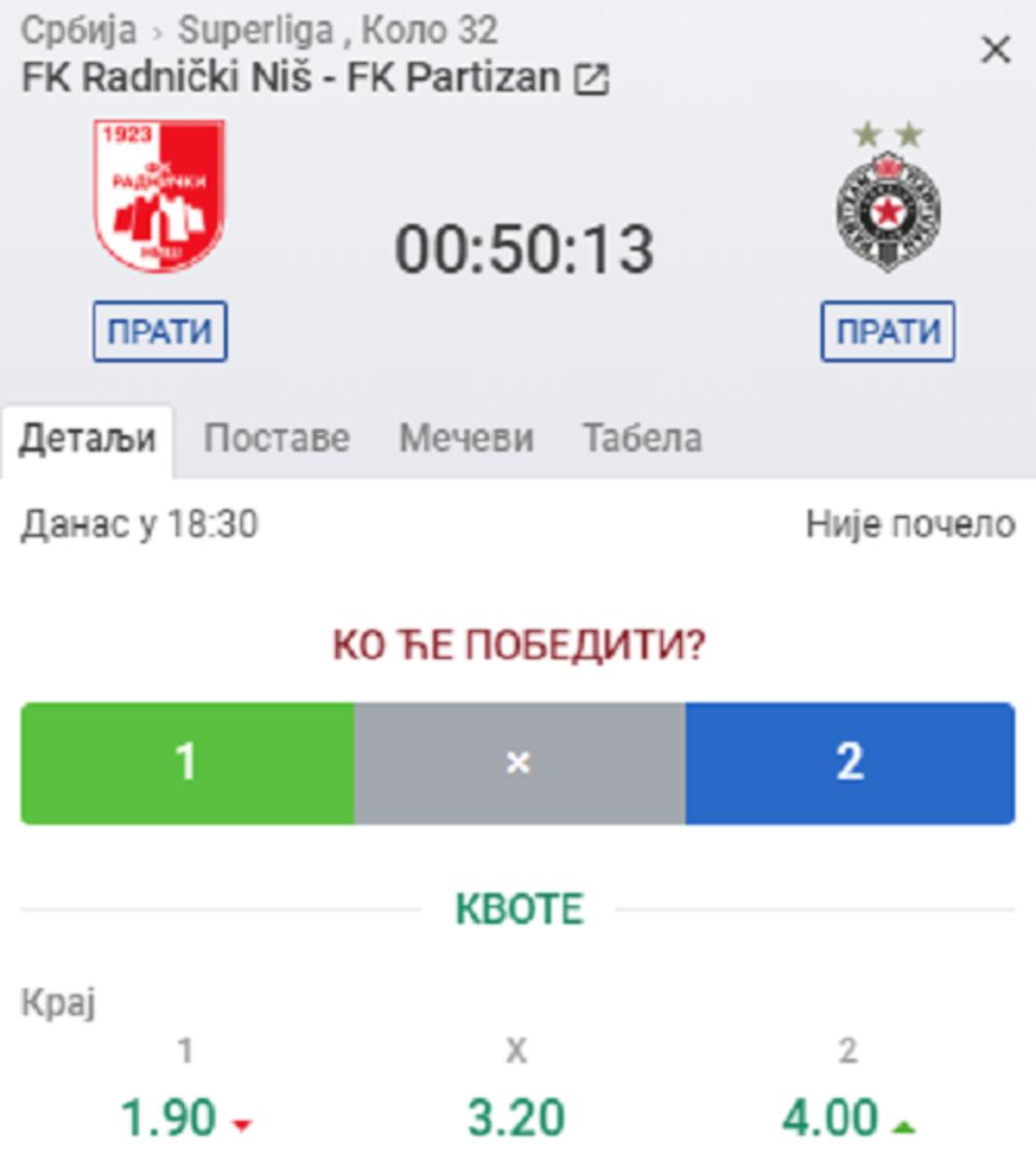 17:30 - Kvota na Partizan je u toku dana bila na oko 2.20 u proseku, dok je neposredno pred meč skočila na 4.00
