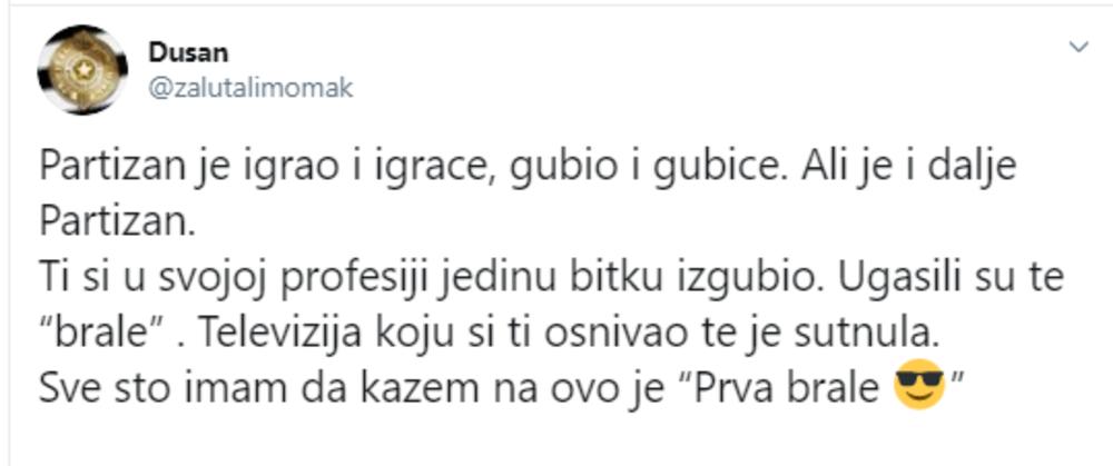 Srpski voditelj deklasiran kao osvedočeni navijač Crvene zvezde, oglasio se na Tviteru nakon meča Partizana i Voždovac gde su gosti sa "krova" slavili rezultatom 2:1 posle gola u nadoknadi meča.