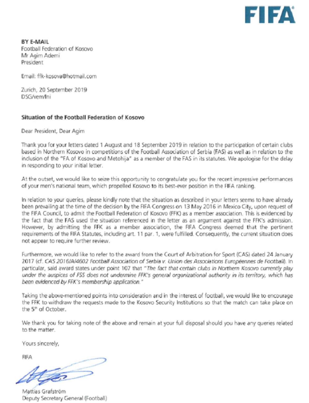 Deluje da je upravo ovo pismo FIFA značajno promenilo stvari u ovoj situaciji, a ovo je jedan primerak tog pisma i dokaz da je ono zaista poslato na adresu FS tzv. Kosova.