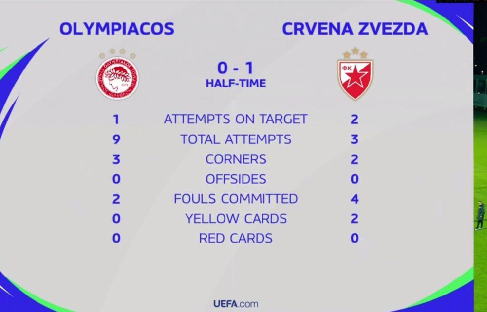 62' Dobra prilika za Zvezdu, Vukanović je dobio loptu od Ivanića, izbegao ofsajd, ali dodao završni pas igračima Olimpijakosa, a ne svojim napadačima.