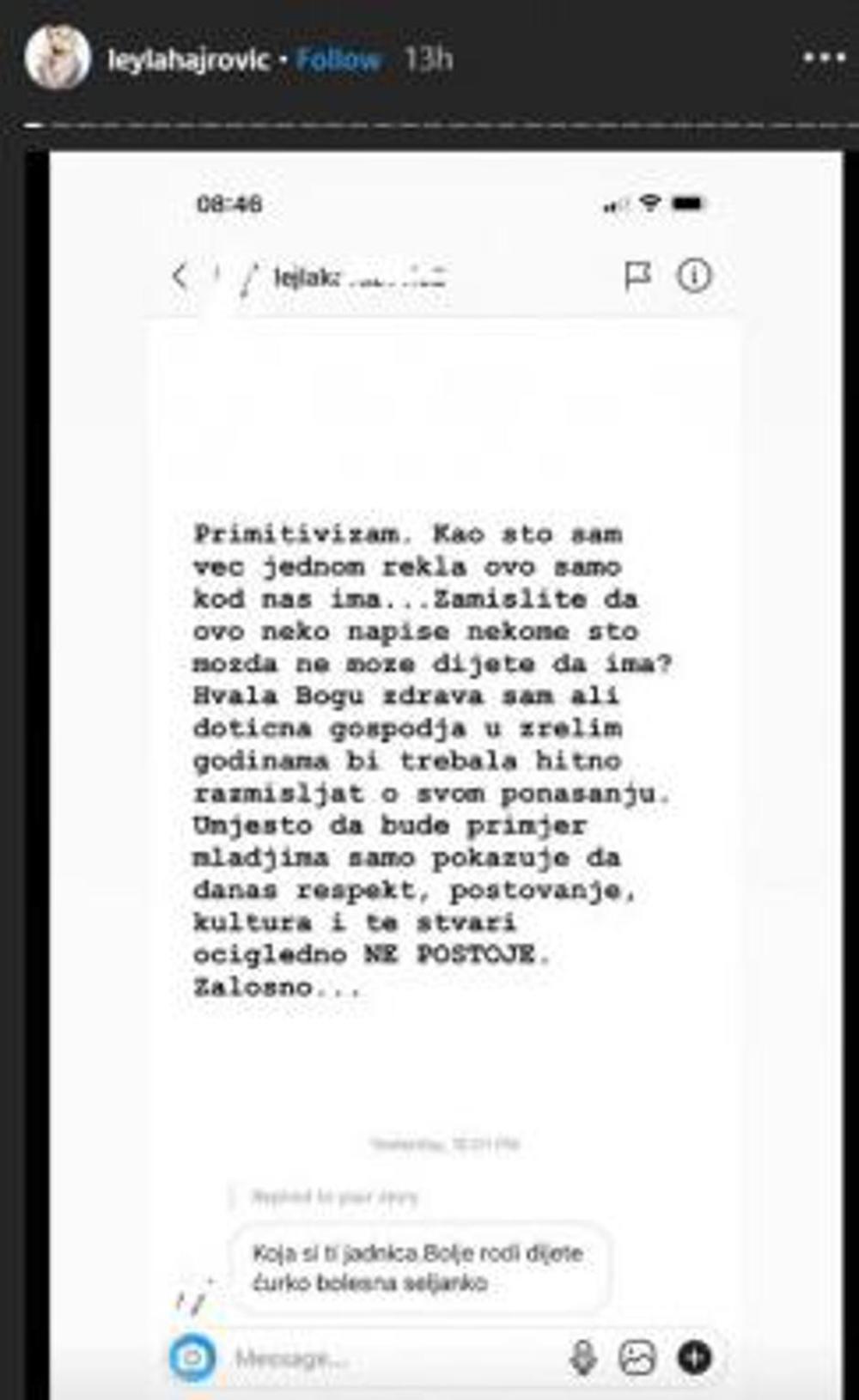 - Koja si ti jadnica. Bolje rodi dete, ćurko bolesna, seljanko - napisala je pratiteljica, na šta joj Lejla nije ostala dužna.