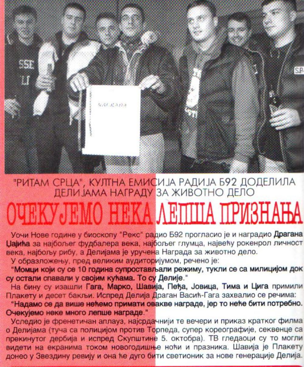 2000. godine navijači Crvene zvezde dobile su nagradu za životno delo od strane B92, a nagrada je bila zbog zasluga u petooktobarskoj revoluciji.