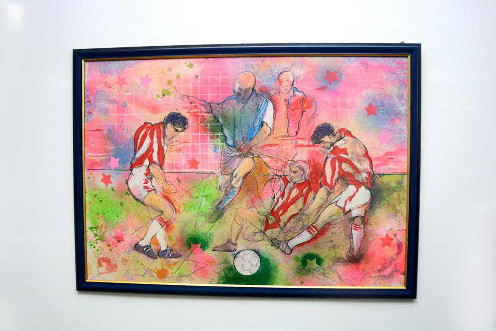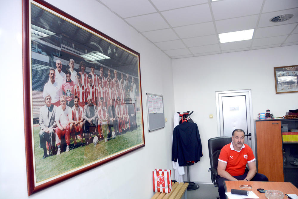 Kancelarija šefa Crvene zvezdeMiodrag Grof Božovića u ovom tekstu ćemo opisati enterijer ovog mesta gde su skovane brojne pobedničke taktite. 1991. godine, koja je osvojila titulu evropskog šampiona.foto: Filip Plavčić i televizor gde šef stručnog štaba može da gleda utakmice.foto: Filip Plavčićkao i slikom na kojoj se on nalazi u igračkoj ulozi Crvene zvezde.