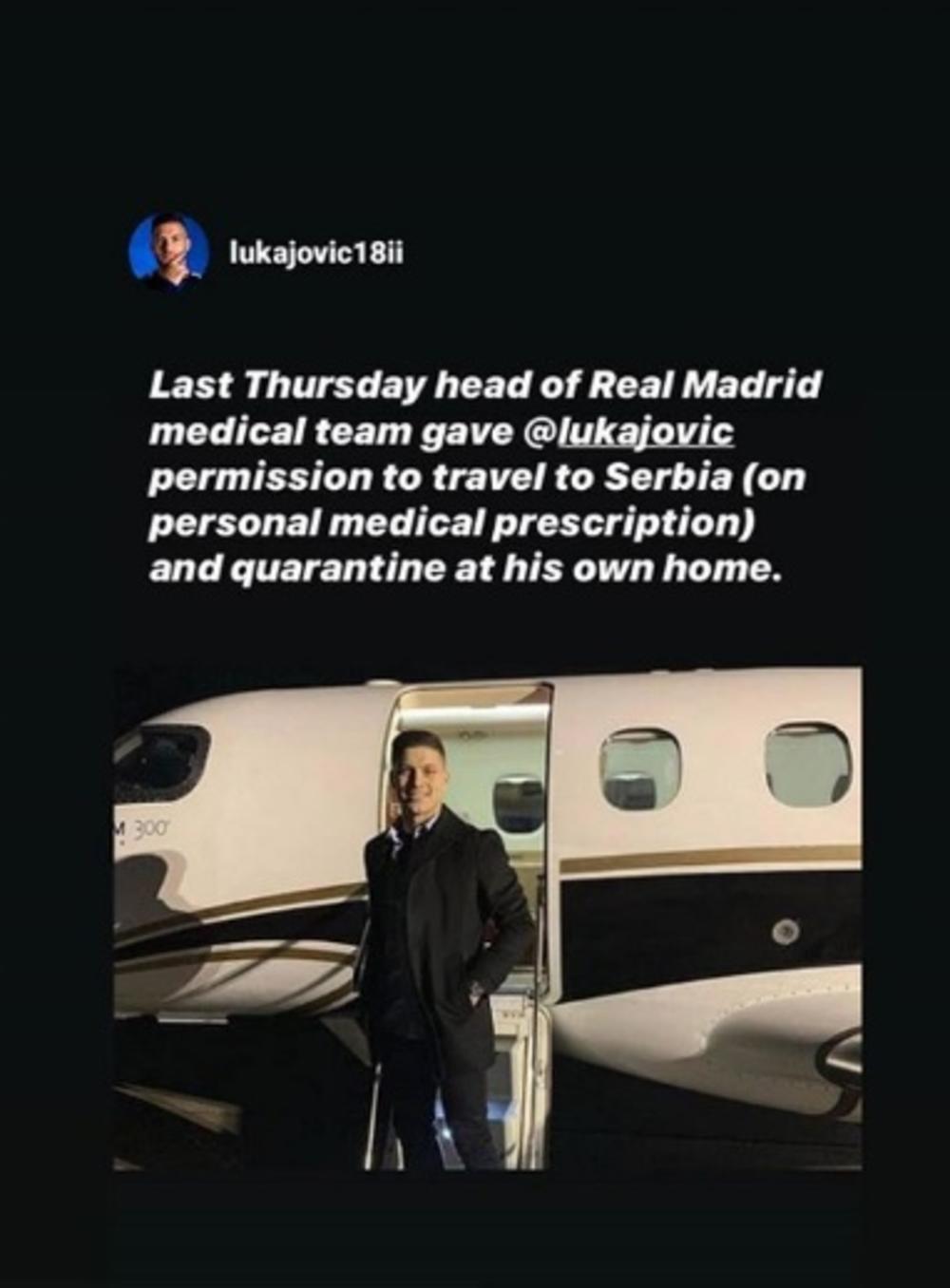 - Prošlog četvrtka šef medicinskog tima Real Madrida mi je dao dozvolu da otputujem za Srbiju i budem u karantinu u svom domu - piše na Instagramu.