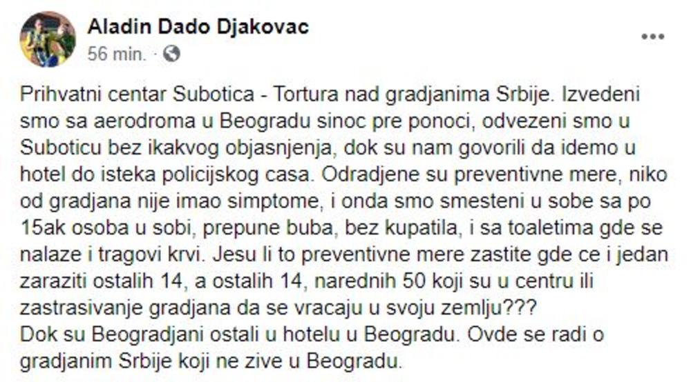 - Izvedeni smo sa aerodroma u Beogradu sinoć pre ponoći i odvezeni smo u Suboticu bez ikakvog objašnjenja, dok su nam govorili da idemo u hotel do isteka policijskog časa. Odrađene su preventivne mjere i niko od građana nije imao simptome - napisao je Đakovac, dodavši: