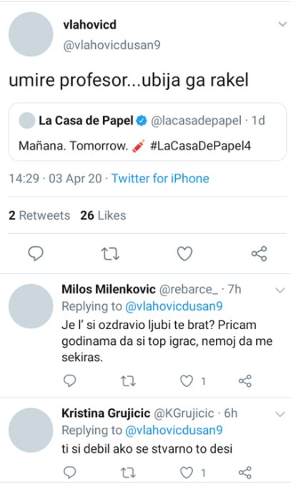 Vlahović je rečenicom "Profesor umire, ubija ga Rakel" izazvao gnev kod ljubitelja pomenute serije, a da li je to zaista kraj, ili se srpski napadač šalio, ostaje na vama da vidite.