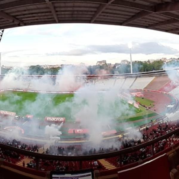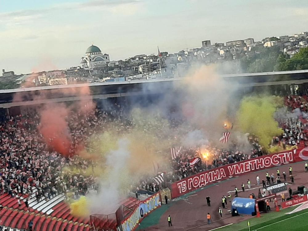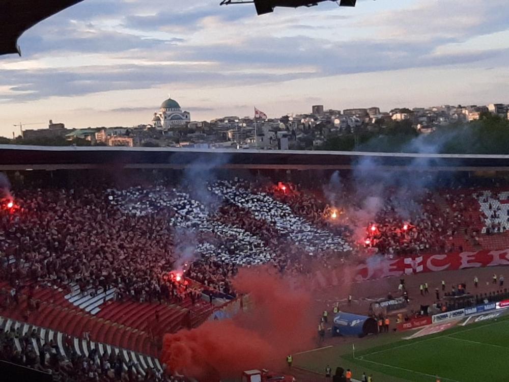 19.15 - Navijači Zvezde su podigli i zanimljivu koreografiju na severnoj tribini, tačnije šetalicu sa likom Vladimira Petrovića Pižona iz vremena kada je igrao za crveno-bele koja je ujedno i podsetnica da klub ove godine je proslavio 75 godina postojanja.