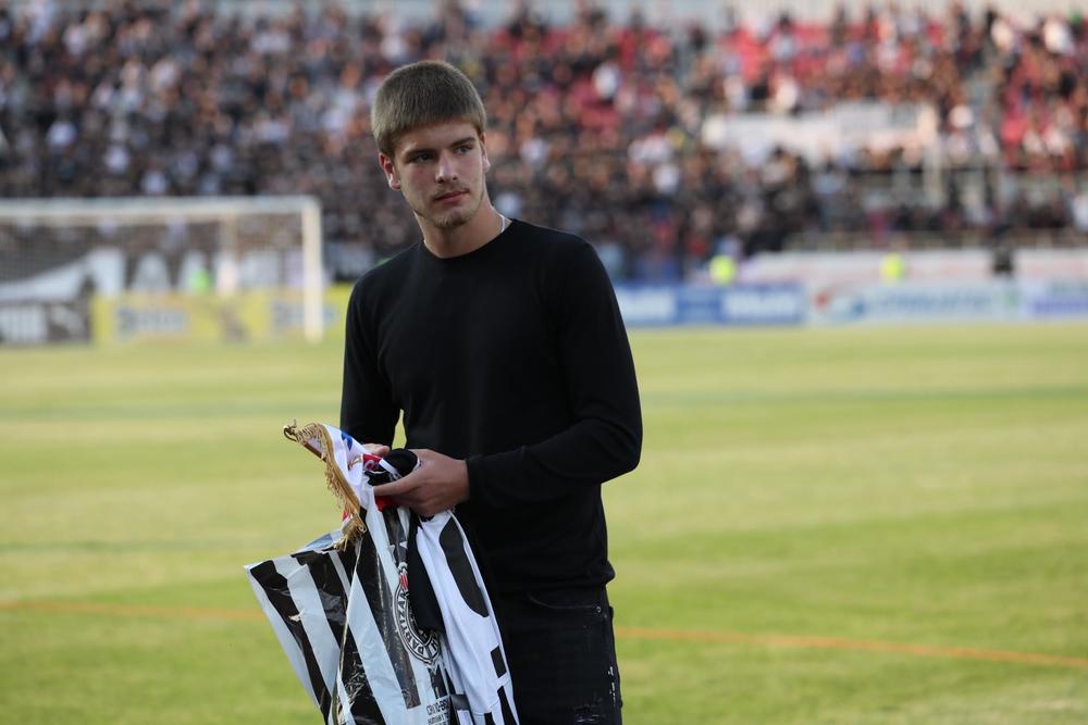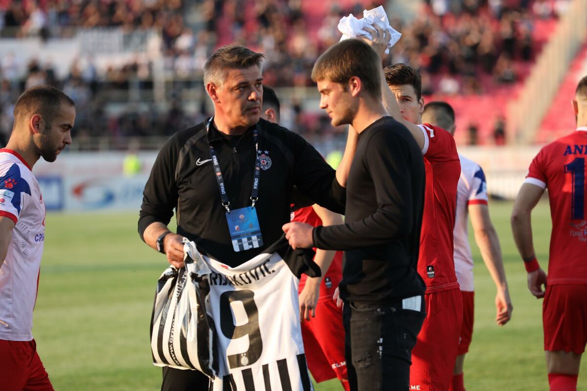 Pred prvi sudijski zviđduk Savo Milošević i kapiten Novosađana Nikola Drinčić poklonili su po dres Urošu Mrdakoviću, sinu tragično preminulog srpskog fudbalera Miljana Mrdakovića.