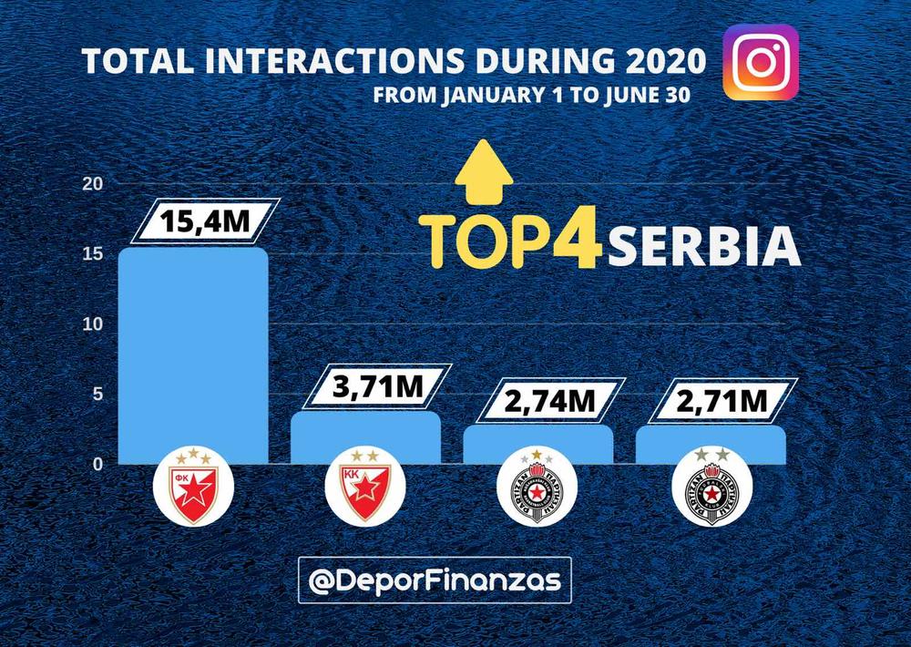 Prema istraživanju agencije ‘Deportes&Finanzas’, koja se bavi društvenim mrežama, za period od januara do juna 2020. godine, klub sa Marakane je u Srbiji ekipa sa najviše interakcija, čak 15,4 miliona.