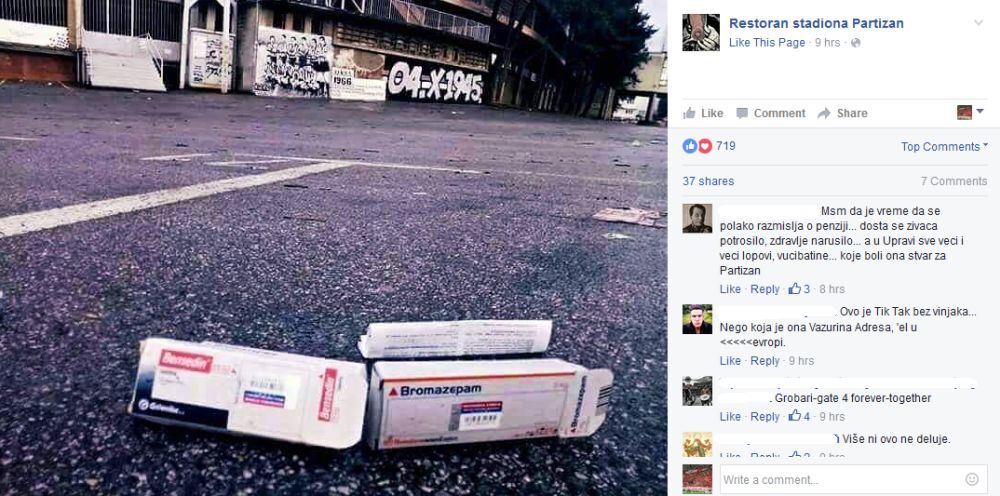 Tako se jutros na društvenim mrežama pojavila interesantna fotografija koju dele Grobari, a na njoj se vide bromazepam i bensendin (lekovi za smirenje prim. aut.) ispred stadiona u Humskoj, a komentari su uglavnom da više ni lekovi ne pomažu.