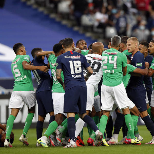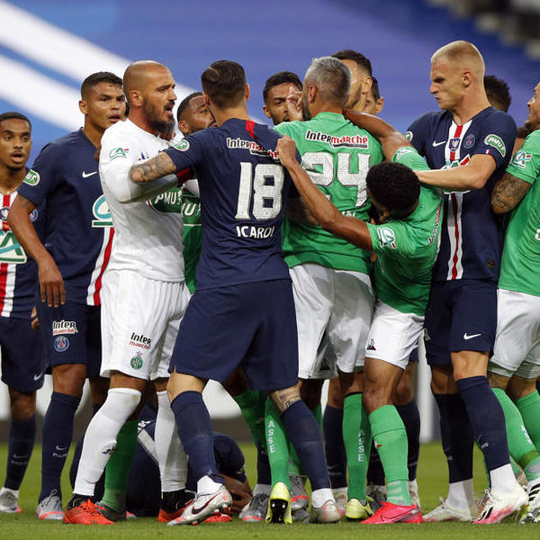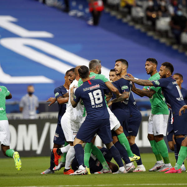 Prvi takmičarski fudbalski meč u Francuskoj obeležio je jezivi start nad Kilijanom Mbapeom i tuča igrača u prvom poluvremenu finala francuskog Kupa između PSŽ-a i Sent Etjena.