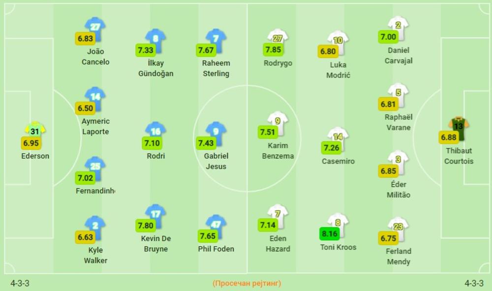 Poveli su izabranici Pepa Gvardiole nakon nestvarne greške Varana, koju su iskoristili Žesus i Sterling za ranu prednost. Izjednačio je Benzema sjajnim udarcem glavom na isteku pola sata utakmice i to je bio konačan rezultat prvog dela igre.