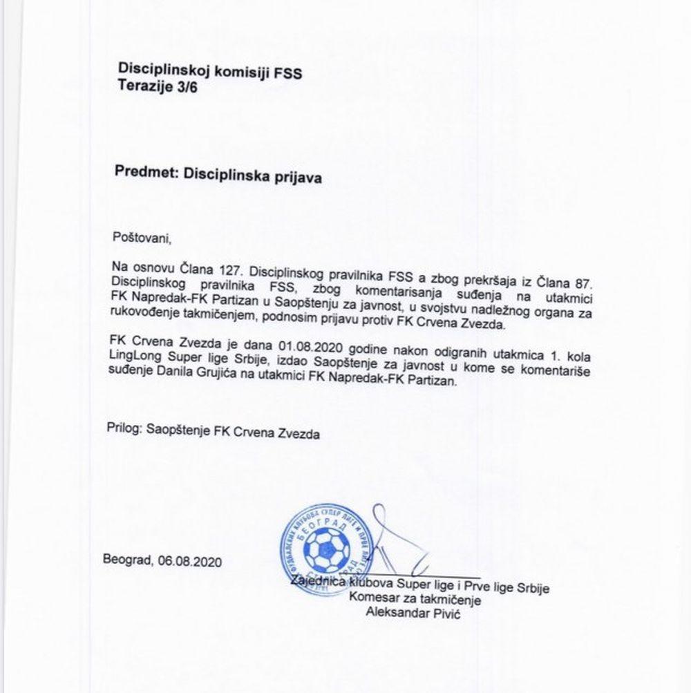 Potpredsednik crno-belih je u svojoj prijavi naveo da je time prekršen Disciplinski pravilnik koji zabranjuje javno komentarisanje suđenja u medijima, a kako prema njemu nije moguće podneti protiv kluba prijavu, on je prijavio Zvezdana Terzića kao direktora Zvezde koja je izdala saopštenje.