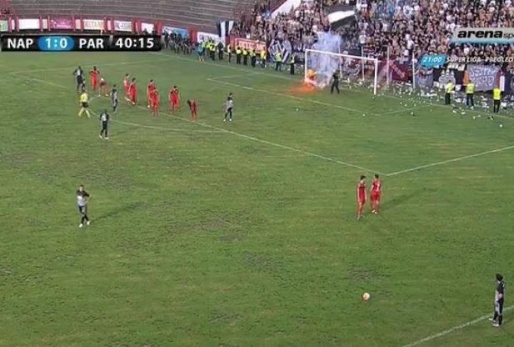 Naime, crno-beli su se spremali da izvedu prekid, a sa tribine iza gola poletela je baklja.