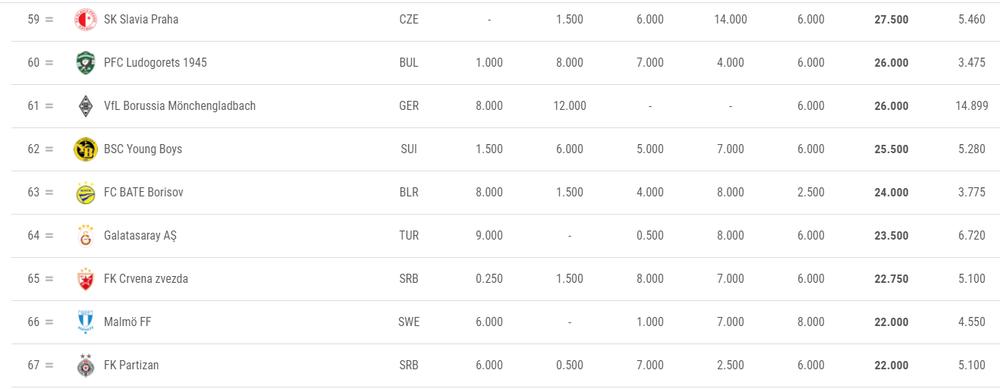 To potvrđuje i najnovija rang lista UEFA, gde srpski šampion i vicešampion zauzimaju visoke pozicije, Zvezda (65.) i Partizan (67).