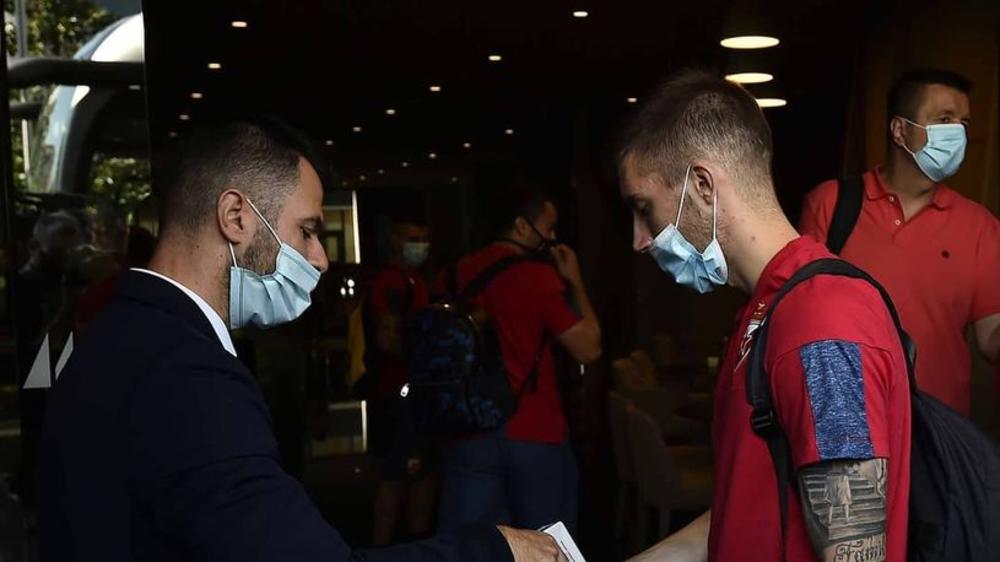 Na fotografijama se vidi da su svi igrači nosili maske zbog korona virusa, kao i da im je osoblje hotela merilo temperaturu na ulazu.